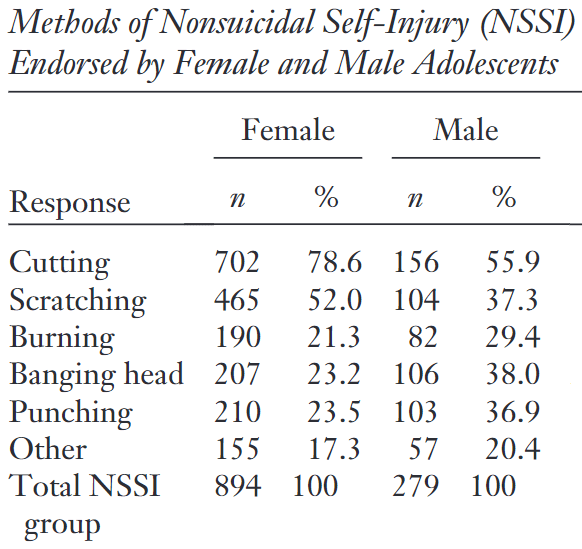 [9] Victor, S. E., Muehlenkamp, J. J., Hayes, N. A., Lengel, G. J., Styer, D. M., & Washburn, J. J. (2018). Characterizing gender differences in nonsuicidal self-injury: Evidence from a large clinical sample of adolescents and adults. Compr Psychiatry, 82, 53-60. https://doi.org/10.1016%2Fj.comppsych.2018.01.009