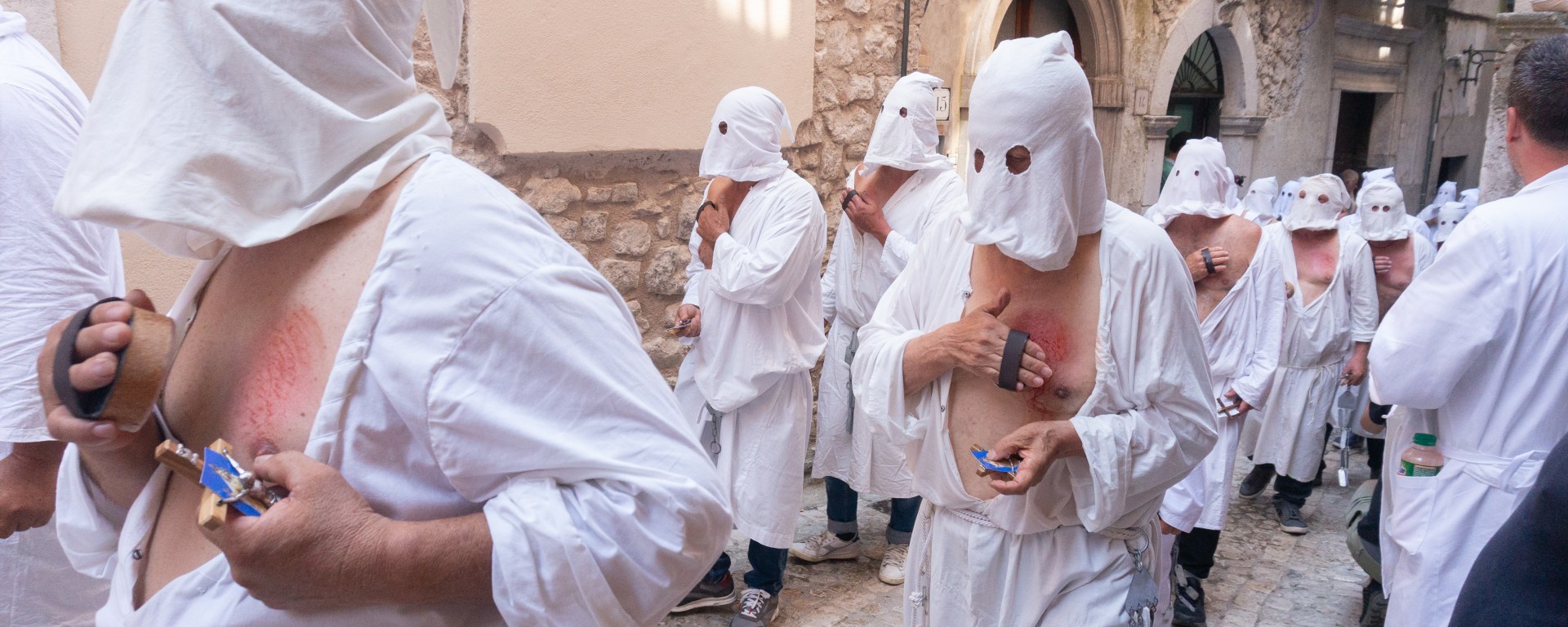 After the penitents and the public finished gathering in the square of the basilica dell’Assunta, a mass was held, and then the processione generale started, beginning with the shout “Fratelli, in nome della Vergine Assunta, con forza e coraggio, battetevi!”. This call signalled to the battenti to start their mortification, and so they started marching out of the square, beating their chest with the spugna.