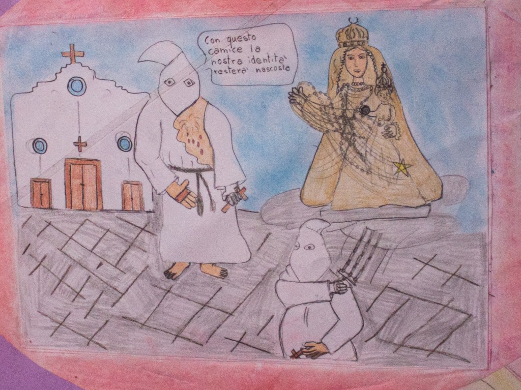 The processione generale is definitely the most popular and controversial part of Riti. It attracts believers, photographers, journalists, and curious people who are keen to witness the uncanny acts of public corporal penance that take part during it, some of the last that still exist in Europe. It isn’t surprising, given how rare mortification of the flesh has become, and our difficulty to understand it in a modern world where physical pain and religion are less present in our daily lives. Though it is important to keep in mind that to the penitents, this is not a form of masochism. They claim they don’t enjoy the pain per se, but rather see it as a way to reflect on their sins, repent, and get closer to God. Suffering without an internal spiritual reflection holds no value in Christianity2.