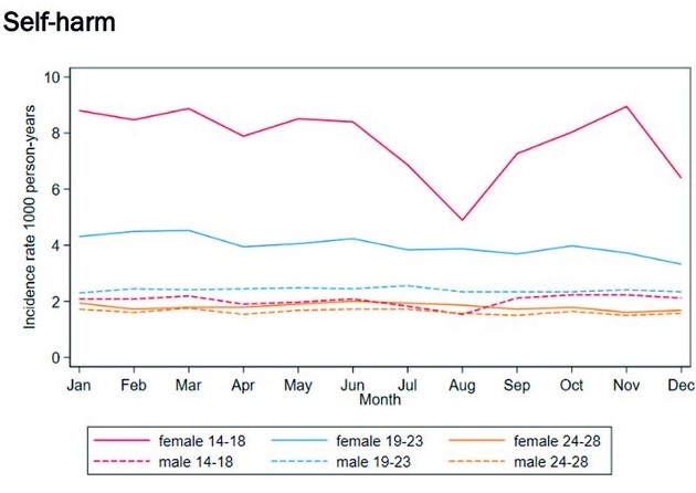 Overall, they didn’t notice an evolution of self-harm throughout the year, except that girls self-harmed less frequently during the summer. Let’s keep in mind that in the UK, self-harm doesn’t refer to self-injury only, but also includes self-poisoning and suicide attempts.